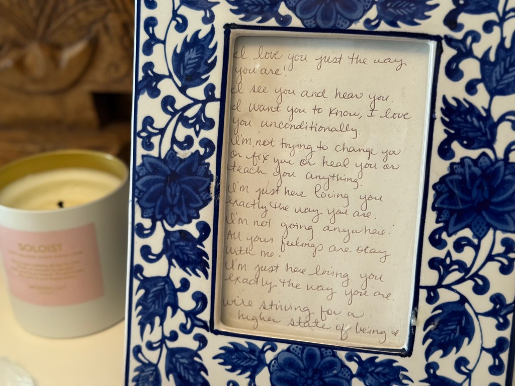 “I love you just the way you are. All your feelings and emotions are safe with me. I’m not trying to change you or teach you; I’m just here, loving you exactly the way you are.”
